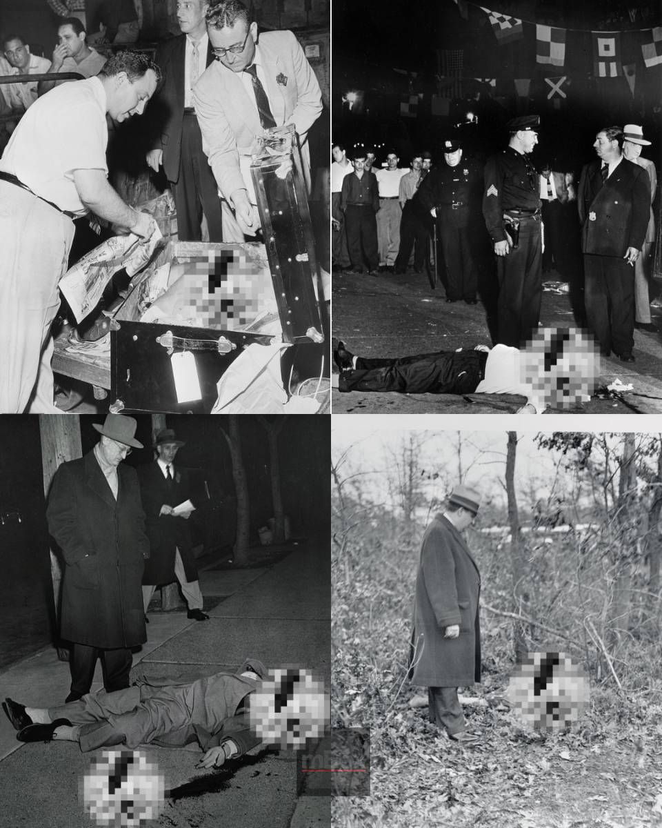 One image shows detectives gathered around a body folded into a suitcase in 1957. One officer in a suit handles the case without gloves while another in short sleeves casually lifts out torn newspaper that has been stuffed around the corpse.